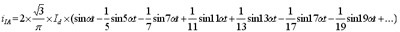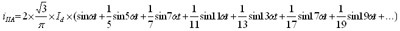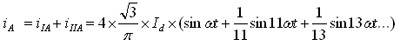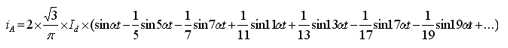 當忽略三相橋式可控硅整流電路換相過程和電流脈動,假定交流側電抗為零,直流電感為無窮大,延遲觸發角a為零,則交流側電流傅里葉級數展開為: