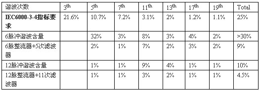 采用12脈沖整流器+11次諧波器可達到小于4.5%的電流諧波指標。單次諧波和總諧波含量均滿足IEC61000-3-4的指標要求。